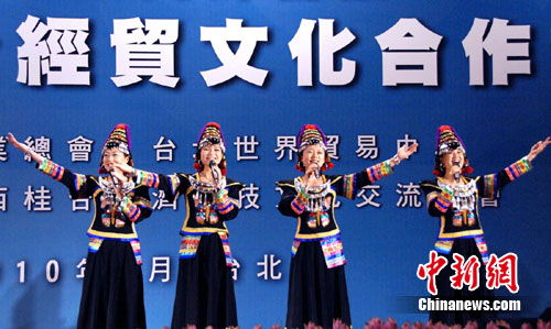 廣西壯族自治區(qū)黨委書記郭聲琨率領(lǐng)1000余人的廣西經(jīng)貿(mào)文化代表團(tuán)7月1日—7月5日在臺灣參訪,客家人聚居的廣西賀州市隨廣西團(tuán)一起赴臺,廣西代表團(tuán)一項重頭戲活動就是舉行桂臺經(jīng)貿(mào)文化合作論壇,賀州客家姑娘唱起客家山歌為活動助興。作 者:廖祖平