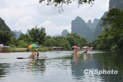 7月23日,游客在廣西桂林陽朔縣遇龍河景區(qū)漂流。當日,桂林市旅游局的統(tǒng)計數(shù)據(jù)顯示,今年1—6月,桂林市接待海內(nèi)外游客近千萬人次,達到了967.89萬人次,同比增長22.15%。 中新社發(fā) 周利朔 攝