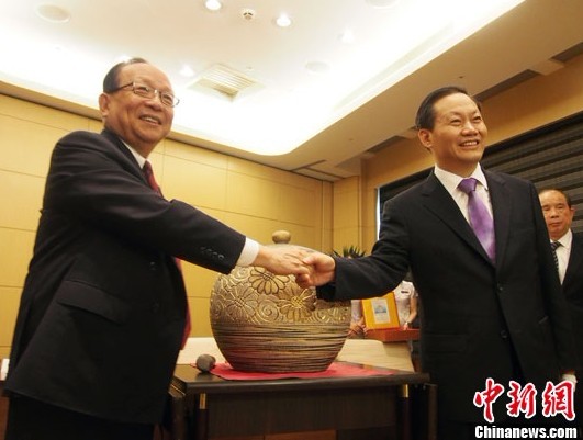 蔣孝嚴(yán)贈送彭清華鶯歌陶瓷“聚寶甕”,意寓為廣西發(fā)展“聚寶”。彭清華則回贈蔣孝嚴(yán)廣西欽州坭興陶。(完)