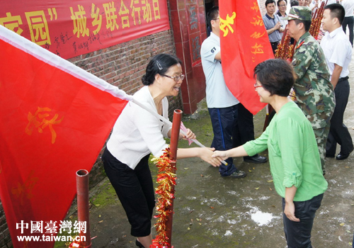 廣西臺(tái)辦副主任唐玉霞向“美麗廣西﹒清潔鄉(xiāng)村”突擊隊(duì)授旗。(圖片來源:廣西臺(tái)辦)