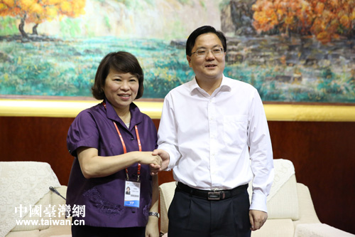 南寧市長(zhǎng)周紅波(右)會(huì)見(jiàn)中國(guó)國(guó)民黨副主席、臺(tái)灣嘉義市市長(zhǎng)黃敏惠。(圖片來(lái)源:南寧市臺(tái)辦)