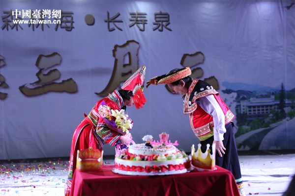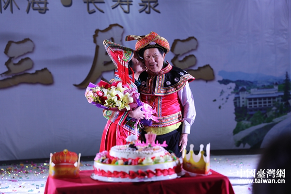 晚會上,兩岸同胞見證了臺灣花蓮縣光復(fù)鄉(xiāng)鄉(xiāng)長謝忠淵及夫人陳麗華50年的愛情故事。在南鄉(xiāng)林!らL壽溫泉旁,他們?yōu)檫@對金婚夫婦舉辦了一場壯族婚禮,讓謝忠淵夫婦穿上壯族婚禮盛裝,按照壯族婚禮的儀式,接受大家的祝福,鮮花綻放、禮炮齊鳴。