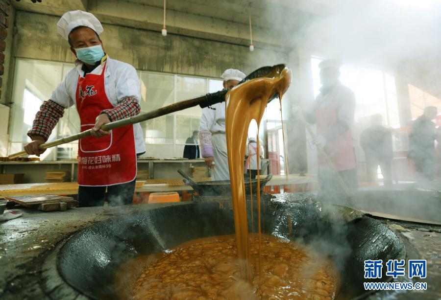 1月13日,工人在貴州省習水縣隆興鎮(zhèn)淋灘村一家紅糖加工作坊內(nèi)熬制紅糖。