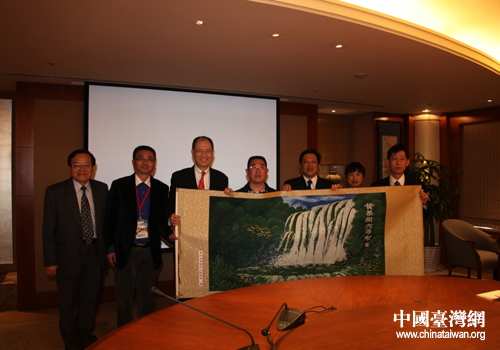 交流團(tuán)領(lǐng)導(dǎo)向臺(tái)泥集團(tuán)董事長(zhǎng)辜成允先生贈(zèng)送蠟染畫。(安順市臺(tái)辦 黃凱 攝)