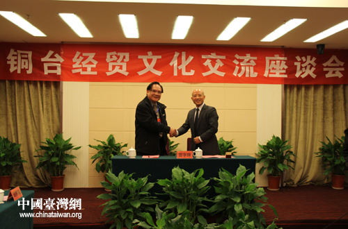會上,臺灣少數(shù)民族交流協(xié)會會長王清堅先生、臺黔投資管理顧問有限公司執(zhí)行董事羅文強先生、織布協(xié)會會長陳啟平先生、紅帝龍生物科技有限公司董事長李春銅先生、牧蟲園有機農(nóng)作股份有限公司董事長翁國禎先生分別作了交流發(fā)言。王清堅與宗文簽署了銅臺交流合作備忘錄。