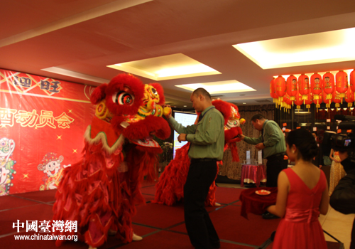 分公司負(fù)責(zé)人為即將登場的彩獅添上點睛之筆。(貴陽市臺辦 段小芬 攝)