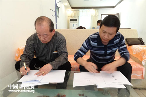 臺商莊震庭先生、副縣長黃元智簽署共同開發(fā)項目意向協(xié)議。(黔南州臺辦 吳建國 攝)