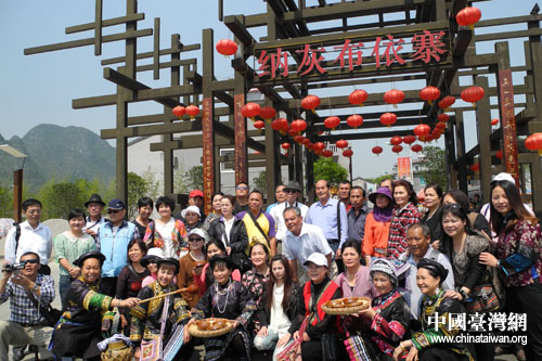 參訪團(tuán)一行在賽門(mén)前與穿著節(jié)日盛裝的布依同胞合影留念。(興義市臺(tái)辦 唐喜美 攝)