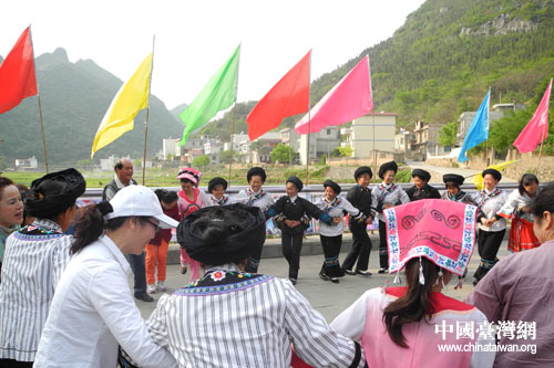 在桔山辦事處滴水社區(qū)考察滴水社區(qū)少數(shù)民族風(fēng)貌時(shí),一條“熱烈歡迎臺(tái)灣花蓮縣海峽兩岸少數(shù)民族交流協(xié)會(huì)到我社區(qū)指導(dǎo)交流”的橫幅懸掛在賽歌臺(tái)前,滴水社區(qū)的布依同胞們歡心鼓舞,敲著鑼打著鼓舞著獅迎接各位嘉賓,精心為為他們準(zhǔn)備了五色飯、民族歌舞、敬上布依米酒,與他們一道載歌載舞,手牽著手、心連著心,共唱《相親相愛(ài)一家人》,交流在友好和諧、依依不舍的氛圍中結(jié)束。
