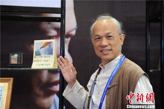 第六屆中國(貴州)國際酒類博覽會(huì)酒類產(chǎn)品衍生館內(nèi),微雕大師陳逢顯介紹其微雕作品。 賀俊怡 攝