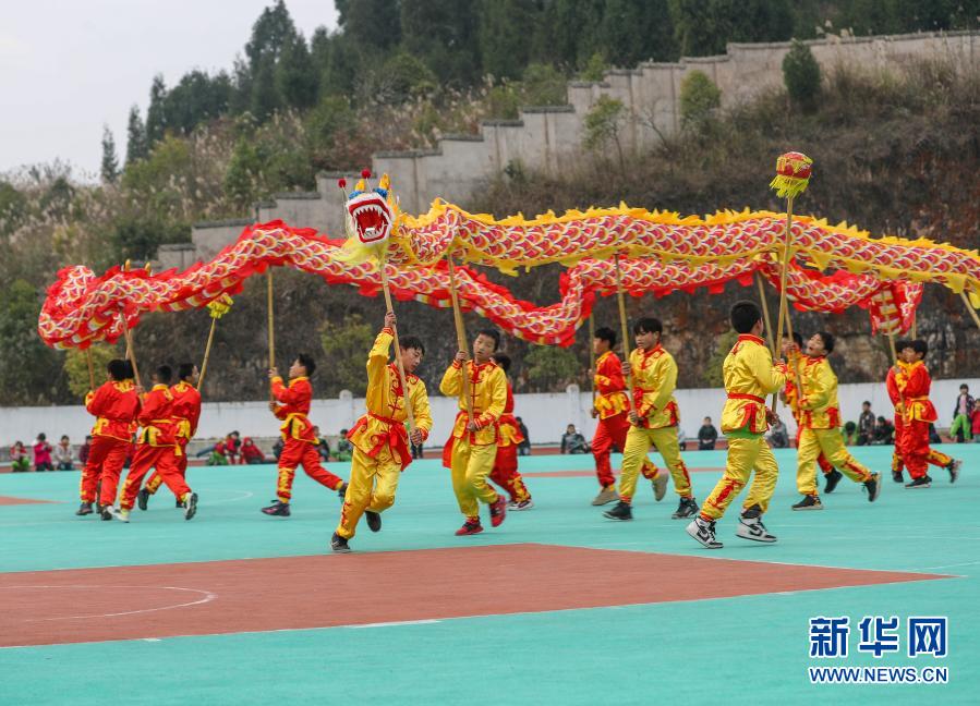 12月25日,在玉屏侗族自治縣朱家場(chǎng)鎮(zhèn)興隆小學(xué),學(xué)生們表演舞龍。