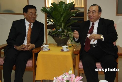 6月7日,中華全國歸國華僑聯(lián)合會(huì)主席林軍一行8人組成的訪問團(tuán)抵達(dá)臺(tái)北,在臺(tái)北重慶南路拜會(huì)臺(tái)灣華僑救國聯(lián)合總會(huì)理事長簡漢生。這是中華全國歸國華僑聯(lián)合會(huì)主席首次赴臺(tái)訪問。 中新社發(fā) 耿軍 攝