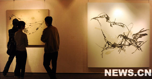 10月10日,觀眾觀看葉永青的繪畫(huà)作品。當(dāng)天,臺(tái)北寒舍空間與大陸知名畫(huà)家葉永青合作舉辦的大型個(gè)展“畫(huà)·涂——葉永青精品收藏展”在臺(tái)北開(kāi)展,14幅葉永青繪畫(huà)精品參展。新華社發(fā)(吳景騰 攝)
