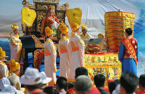 11月1日,湄洲媽祖文化旅游節(jié)上舉行祭典媽祖活動。當(dāng)日,以慶祝媽祖信俗成功申報人類非物質(zhì)文化遺產(chǎn)為主要活動內(nèi)容的第十一屆中國湄洲媽祖文化旅游節(jié)在媽祖故鄉(xiāng)福建湄洲島開幕。來自海內(nèi)外26個國家和地區(qū)的萬余名中華兒女齊聚湄洲島,圍繞“同謁媽祖,共享平安”的主題,舉行包括媽祖祭典、海峽媽祖文化旅游推介會和第五屆湄洲媽祖海峽論壇等內(nèi)容的活動。新華社記者姜克紅攝