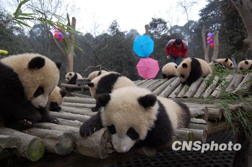 2月3日,臥龍中國保護大熊貓研究中心2009年繁育成活的16只大熊貓寶寶,搬進了大熊貓幼兒園的集體宿舍,離開媽媽開始獨立生活。16只大熊貓寶寶均在5-8月齡之間,已基本具備了獨立生活的能力。