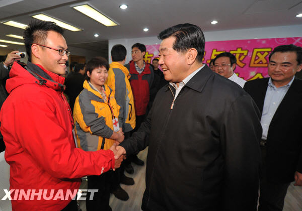 賈慶林與醫(yī)療救援隊(duì)成員親切握手。新華社 黃敬文 攝