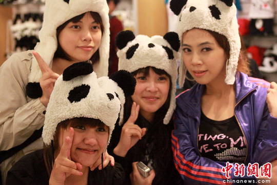 5月23日,來到臺北木柵動物園熊貓館參觀的4位年輕臺灣女孩在熊貓紀(jì)念品店選購紀(jì)念品,并一起戴上熊貓帽子合影留念。隨著“團(tuán)團(tuán)”“圓圓”成為木柵動物園里的動物明星,大熊貓?jiān)谂_受熱捧,引來參觀客絡(luò)繹不絕。中新社發(fā) 羅欽文 攝