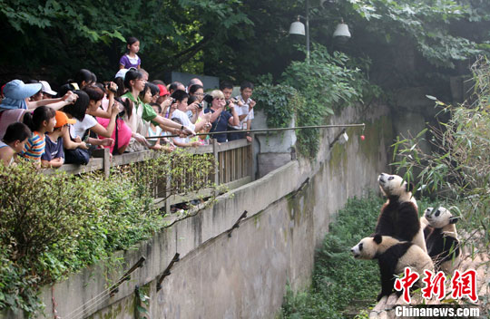 7月29日,受中共四川省委書記劉奇葆邀請,由臺灣民意代表馬文君率領(lǐng)的126名臺灣“9·21”大地震災(zāi)區(qū)和“8·8”風(fēng)災(zāi)災(zāi)區(qū)的學(xué)生來到成都大熊貓繁育研究基地,與大熊貓近距離接觸中新社發(fā) 劉忠俊 攝