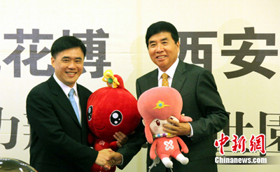 9月14日,臺(tái)北市市長(zhǎng)郝龍斌與西安市市長(zhǎng)陳寶根在臺(tái)北舉辦儀式,啟動(dòng)兩市未來(lái)一整年的園藝接力與文化合作計(jì)劃。臺(tái)北市與西安市將在未來(lái)一年中次第舉辦花博會(huì)、世園會(huì)兩項(xiàng)重要的世界園藝博覽會(huì),雙方將開展多項(xiàng)具體合作規(guī)劃。中新社記者 劉舒凌 攝
