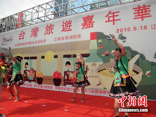18日,臺灣海峽兩岸觀光旅游協(xié)會(簡稱臺旅會)在南京舉行“臺灣旅游嘉年華”。這是臺旅會在大陸首度舉辦的戶外嘉年華推廣活動。在此間上午的嘉年華盛會上,臺灣藝術家們熱情火辣的原住民歌舞表演,將現(xiàn)場氣氛推至高潮。