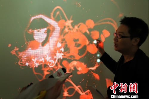 以鄧麗君為主題的臺(tái)北花博“名人館”,10月6日首次向媒體公開(kāi)。圖為展館重頭戲“花語(yǔ)廳”內(nèi)設(shè)置的“落英繽紛”藝術(shù)裝置,可讓多位參觀(guān)者同時(shí)伸手掬起一朵朵鄧麗君生前最喜愛(ài)的玫瑰花(數(shù)碼模擬),使其累積疊加,幻化成鄧麗君令人懷念的容貌。