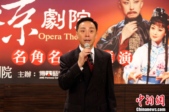 10月14日,著名京劇藝術家于魁智在臺北亮相。圖為于魁智在當天的記者會上即興演唱傳統(tǒng)劇目《上天臺》選段。 中新社發(fā) 王健 攝