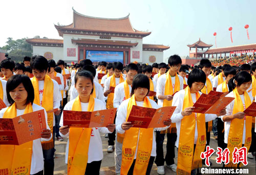11月1日,參加第十二屆中國·湄洲媽祖文化旅游節(jié)開幕式的兩岸千名信眾身披金色的綬帶,吟誦媽祖頌文、展現(xiàn)媽祖文化這一中華優(yōu)秀傳統(tǒng)文化薪火相傳的壯觀場面。 當(dāng)日,兩岸攜手舉辦的第十二屆中國·湄洲媽祖文化旅游節(jié)福建湄洲島開幕,來自世界各地的媽祖宮廟代表及海內(nèi)外萬余名信眾前來參加該媽祖文化旅游節(jié)。