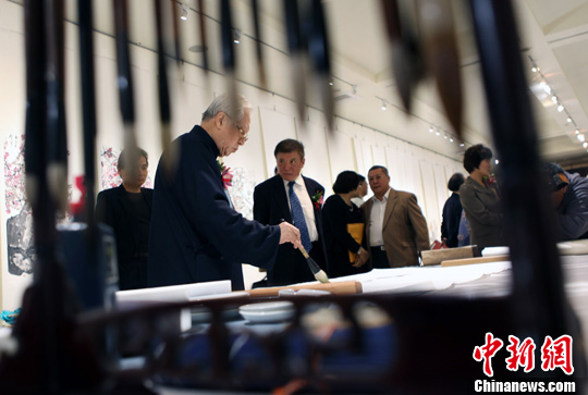 12月14日,大陸著名的開明畫院臺北書畫展在臺北開幕。兩岸畫家還當場揮毫,進行了一場別開生面的中國書畫筆會。圖為臺灣著名畫家、中研院嶺南美術(shù)館榮譽館長歐豪年在筆會上作畫。中新社記者 黃少華 攝