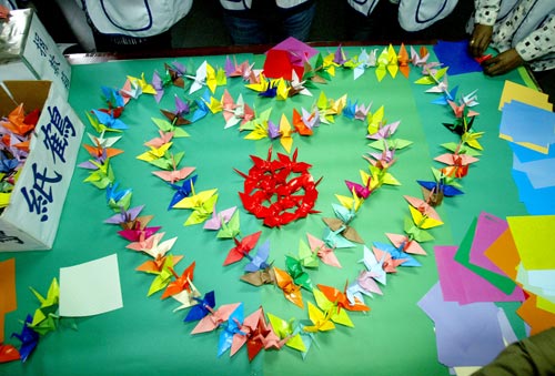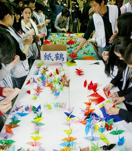 臺(tái)灣師范大學(xué)教學(xué)中心15日舉行“日本加油”折紙鶴募款活動(dòng),校內(nèi)來(lái)自各個(gè)國(guó)家和地區(qū)的學(xué)生紛紛折紙鶴祈福,并吁全校師生踴躍捐款,協(xié)助日本度過(guò)難關(guān)。圖片來(lái)源:臺(tái)灣“中央社”