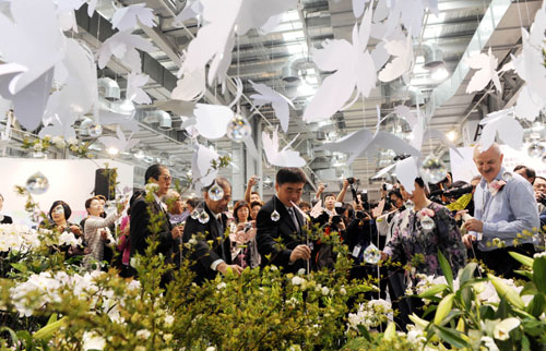 2011洲際杯花藝競賽19日在花博爭艷館登場,由臺灣百名花藝?yán)蠋熅闹谱鞯摹盎ㄖ琛,在開幕式中吸引眾人目光,盼透過象征“福氣”的蝴蝶,為世界祈福。 圖片來源:“中央社”