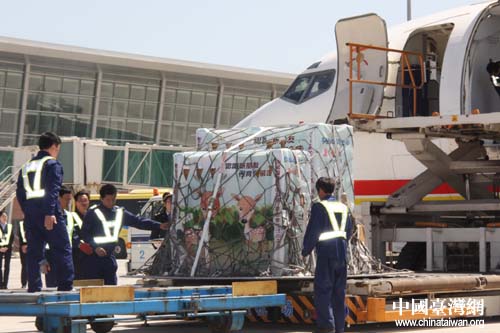 “繁星”、“點(diǎn)點(diǎn)”、“喜羊羊”、“樂(lè)羊羊”順利抵達(dá)威海機(jī)場(chǎng)。圖為機(jī)場(chǎng)地勤人員準(zhǔn)備接“寶貝”們下飛機(jī)。(中國(guó)臺(tái)灣網(wǎng) 劉海偉 攝)