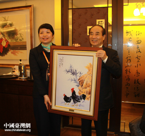 2011年4月18日,臺(tái)灣十大杰出青年基金會(huì)歡送大陸高校師生參訪團(tuán)一行,圖為十大杰出青年基金會(huì)王金平董事長(zhǎng)與中國(guó)宋慶齡基金會(huì)聯(lián)絡(luò)部陳愛民部長(zhǎng)互換禮物。(中國(guó)臺(tái)灣網(wǎng) 楊永青 攝)