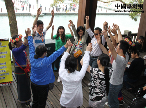2011年4月12日,大陸高校師生在日月潭風(fēng)景區(qū)與原住民一起載歌載舞。(中國(guó)臺(tái)灣網(wǎng) 楊永青 攝)