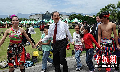 4月25日,率廣西經(jīng)貿(mào)文化代表團訪問臺灣花蓮縣的廣西壯族自治區(qū)主席馬飚和當?shù)孛癖娛掷痔饒A圈舞,場面十分歡快。中新社發(fā) 林艷華 攝