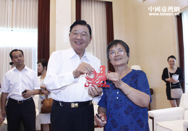 23日,首屆兩岸和諧家庭合唱節(jié)在遼寧省鐵嶺市隆重開幕。臺灣三三會會長、前;鶗麻L江丙坤率團參加活動。圖為江丙坤在參觀民間剪紙藝術時獲鐵嶺市非遺產文化傳承人,有名的剪紙藝人艾玉芹贈送寓意好運的福猴抱桃剪紙貼畫。(中國臺灣網 普燕 攝)