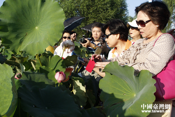 臺灣雅樂合唱團參觀蓮花湖濕地公園中的怡荷園時,與最盛時能有三千多花瓣的名品荷花留影。(中國臺灣網 普燕 攝)