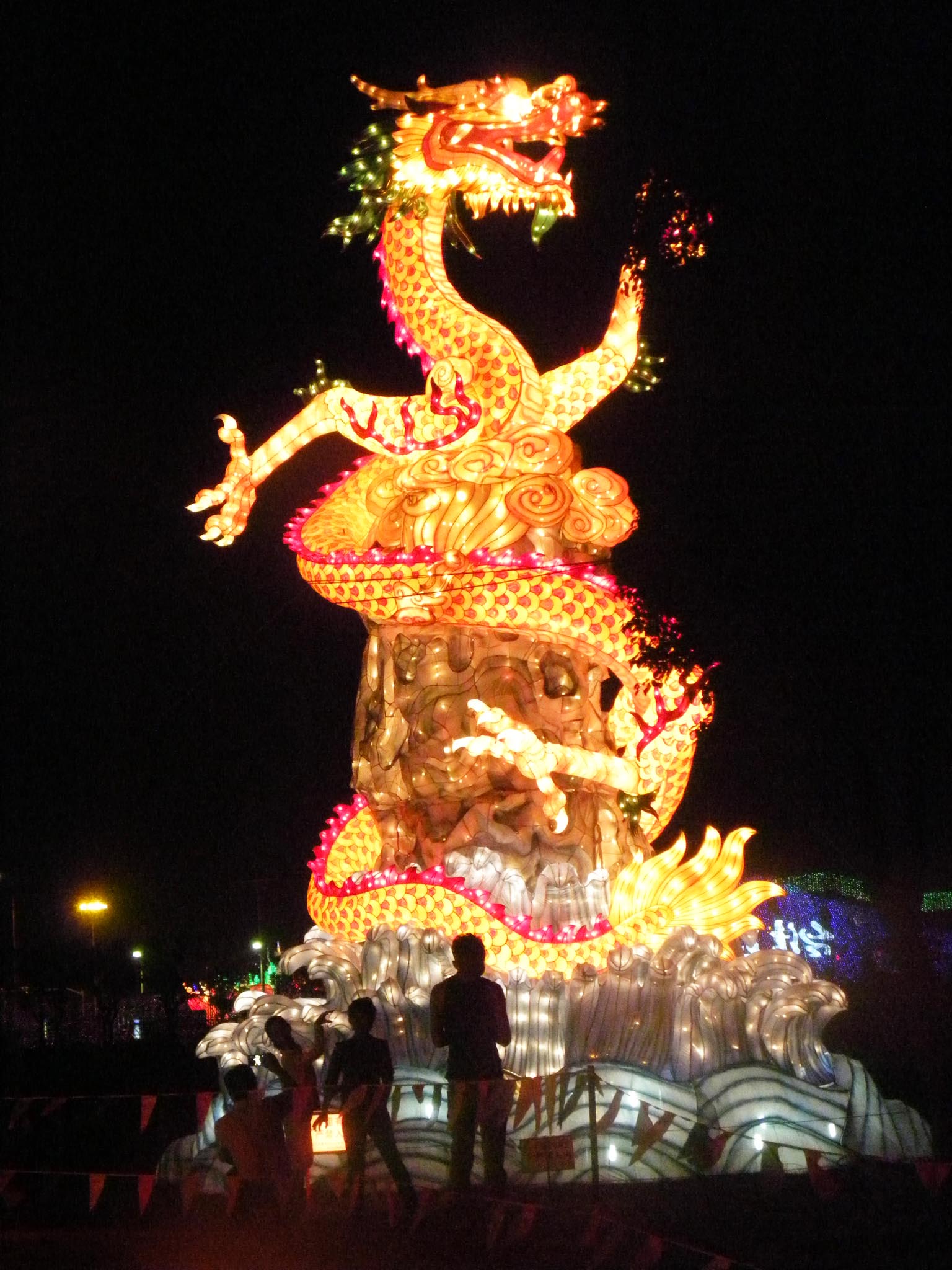 薈萃兩岸傳統(tǒng)文化的首屆海峽兩岸(昆山)中秋燈會9月14日晚首度試燈,當(dāng)晚60多組大型燈組、30萬平方米七大主題燈區(qū)美輪美奐。一組組流光溢彩的花燈呈現(xiàn)著兩岸相近的中秋民俗傳統(tǒng)、文化風(fēng)貌以及風(fēng)格各異的江南水鄉(xiāng)元素、臺灣媽祖文化等特色文化,兩岸民眾喜聞樂見的花卉、寓意吉祥的文化元素交相輝映。圖為燈組金龍獻(xiàn)瑞,預(yù)示風(fēng)調(diào)雨順、四季平安。黃瑩 攝