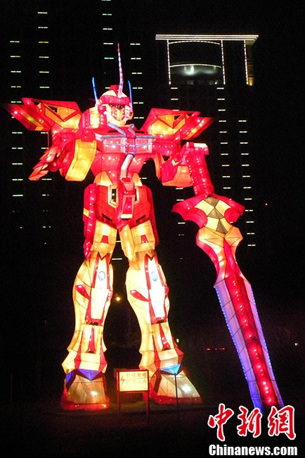 薈萃兩岸傳統(tǒng)文化的首屆海峽兩岸(昆山)中秋燈會9月14日晚首度試燈,當(dāng)晚60多組大型燈組、30萬平方米七大主題燈區(qū)美輪美奐。一組組流光溢彩的花燈呈現(xiàn)著兩岸相近的中秋民俗傳統(tǒng)、文化風(fēng)貌以及風(fēng)格各異的江南水鄉(xiāng)元素、臺灣媽祖文化等特色文化,兩岸民眾喜聞樂見的花卉、寓意吉祥的文化元素交相輝映。圖為動漫區(qū)巨大燈組變形金剛。黃瑩 攝