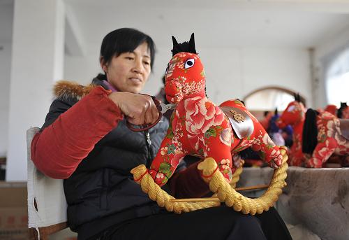 1月13日,山西省長治市黃碾鎮(zhèn)故南村“錦繡坊”的民間藝人在制作準(zhǔn)備銷往臺灣的馬年吉祥物“福運(yùn)馬”!板\繡坊”擁有制作長治傳統(tǒng)手工藝品的“絕活”。此次,民間藝人們獲得了臺灣客戶的訂單,加緊趕制1600只“福運(yùn)馬”,迎接馬年的到來。新華社發(fā)(姚林 攝)