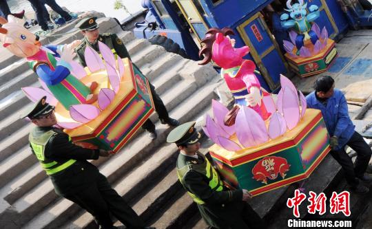 福州連江黃岐邊防派出所官兵協(xié)助工作人員將贈(zèng)送馬祖同胞的花燈搬運(yùn)裝船!⒖筛z