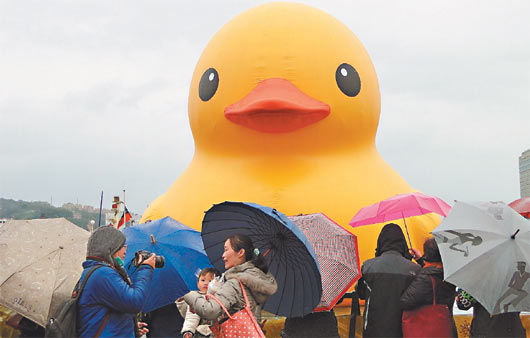 大黃鴨從去年12月21日在基隆展出后,今天下午在微風(fēng)細(xì)雨中謝幕,活動(dòng)發(fā)起人黃景泰在致詞時(shí),感性地寫下謝幕詞,代表他50天來(lái)的心情寫照:“在風(fēng)雨中進(jìn)港,在平靜中返航,大黃鴨在基隆佇留的50天始終淡定,無(wú)視身軀的傷痕和塵埃,用它單純的心靈,散發(fā)溫柔的力量,我們用感恩的心,把快樂(lè)幸福傳遞給大眾,我們用謙卑的心,接受所有的批判,大黃鴨讓我們看清自己,面對(duì)挑戰(zhàn),迎接未來(lái)”。(中國(guó)臺(tái)灣網(wǎng) 朱煉)