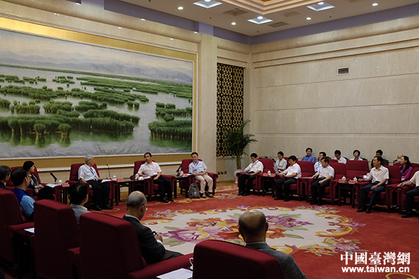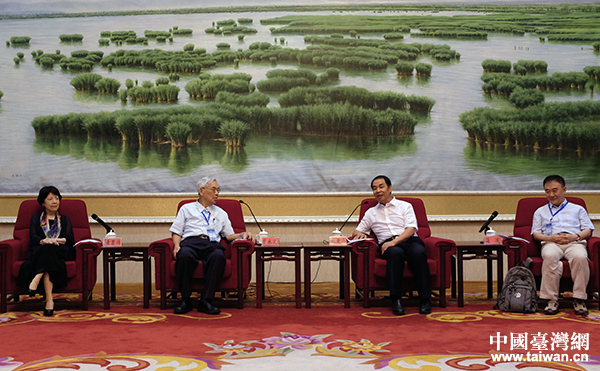 8日晚間,寧夏回族自治區(qū)副主席姚愛興(左三)會見了由臺灣世新大學(xué)講座教授曾永義(左二)擔(dān)任團(tuán)長的“情系絲路·牽手寧夏——兩岸文化聯(lián)誼行”臺灣交流團(tuán)一行。(中國臺灣網(wǎng) 普燕 攝)