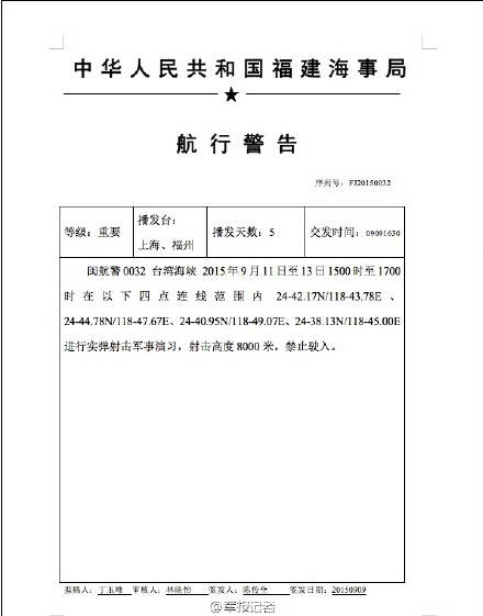據(jù)中國(guó)海事局網(wǎng)站消息,解放軍9月11日至13日15時(shí)至17時(shí)在臺(tái)灣海峽以下四點(diǎn)連線范圍內(nèi)24-42.17N/118-43.78E、24-44.78N/118-47.67E、24-40.95N/118-49.07E、24-38.13N/118-45.00E進(jìn)行實(shí)彈射擊軍事演習(xí),射擊高度8000米,禁止駛?cè)搿?/p>