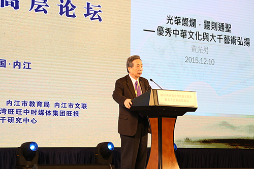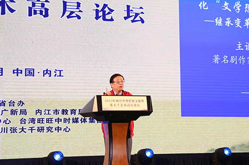 中國臺灣網(wǎng)12月28日內(nèi)江訊 “大千故里論大千,傳承弘揚(yáng)共發(fā)展。承上啟下話傳統(tǒng),華夏文明一脈承!12月25日,2015年兩岸中華傳統(tǒng)文化暨張大千藝術(shù)高層論壇在四川內(nèi)江舉辦,主持人、著名表演藝術(shù)家、中國煤礦文工團(tuán)名譽(yù)團(tuán)長瞿弦和用這樣的開場白開啟了論壇的重頭戲——主題演講。