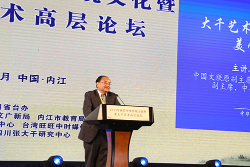 主題演講以“中華傳統(tǒng)文化的傳承與大千藝術(shù)的弘揚(yáng)”為主題,來自大陸的著名劇作家、文學(xué)家、詩人蘇叔陽,中國文聯(lián)原副主席、中國文藝評論家協(xié)會主席、著名評論家仲呈祥,著名劇作家、辭賦作家魏明倫和來自臺灣的臺灣藝術(shù)大學(xué)原校長、臺灣歷史博物館原館長黃光男,臺灣著名詩人、作家鄭愁予,臺灣著名書法家、臺灣中華書學(xué)會會長、淡江大學(xué)教授張炳煌等知名文人學(xué)者分別發(fā)表演講,兩岸近200名文化界、教育界人士、臺商代表、青年學(xué)生共襄盛舉。
