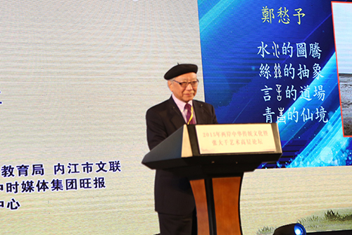 雖然主題演講只有短短兩個(gè)小時(shí)的時(shí)間,但中華傳統(tǒng)文化的博大精深透過兩岸文人的演講讓大家有了更深的體會。鄭愁予以 “漢子玄思的建筑” 為題,為大家描繪了如詩如畫的漢字意境:水的圖騰,絲的抽象,言的道場,青的仙境……;魏明論的一番化“文學(xué)恐龍”為“藝術(shù)孔雀”論述,既有對中華文化具有悠久歷史的辭賦駢文面臨斷裂的憂患,更有其繼承變革,“潛心讀賦,苦吟成駢,爭取把‘文學(xué)恐龍’變革為‘藝術(shù)孔雀’的文學(xué)成就與豪情。