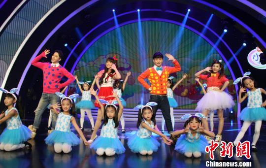 晚會上,臺灣東森電視臺蜜蜂姐姐和福建少兒頻道蝸牛哥哥、長頸鹿哥哥、芭樂姐姐帶動兩岸小朋友作精彩表演!↑S帆 攝