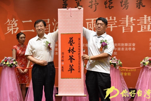 北京市臺(tái)灣同胞聯(lián)誼會(huì)黨組書記王蘭棟代表主辦方接受了國(guó)民黨主席洪秀柱特為此次畫展題寫的“藝林薈萃”條幅(你好臺(tái)灣網(wǎng) 圖)