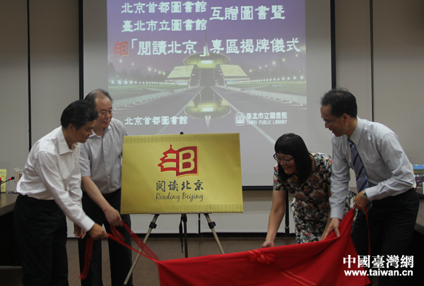 6月26日下午,北京首都圖書館與臺北市立圖書館互贈圖書暨“閱讀北京”專區(qū)揭牌儀式在臺北市立圖書館舉行。北京首都圖書館副館長肖維平、臺北市立圖書館館長洪世昌分別代表兩館互贈圖書。北京市文化局副局長呂先富、北京海峽兩岸民間交流促進會副會長黃塞溪、臺北市文化局副局長李麗珠、臺北市立圖書館館長洪世昌共同為“閱讀北京”專區(qū)揭牌。