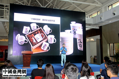 南京創(chuàng)意設(shè)計中心主任王子燁向海外臺灣留學(xué)生長三角研習(xí)營營員們介紹具有南京元素的創(chuàng)意設(shè)計精品。(中國臺灣網(wǎng)記者 李杰 攝)